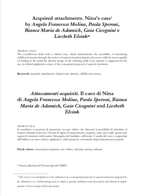 MOLINA, A.F., SPERONI, P., de ADAMICH, B.M., CIGOGNINI, G., ELSINK, L. (2023). Acquired attachments. Nina’s case. Rivista di studi adleriani, 4, 103-107.